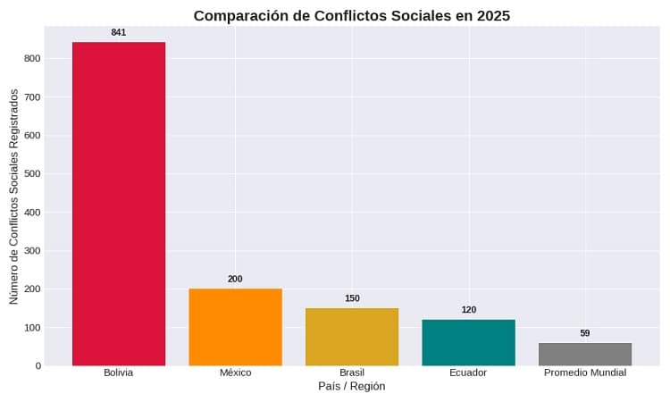 Bolivia no solo está afectada por una cultura de bloqueo, también lidera los niveles de conflictividad en Latinoamérica. En 2025, registró 841 conflictos sociales, la cifra más alta de la región, superando ampliamente a países como Perú (197), Argentina (395 en un mes pico), Chile (conflictos principalmente políticos y territoriales) y Colombia (1.834 eventos en un semestre, aunque más dispersos). Bolivia destaca por la intensidad y frecuencia de sus conflictos, mientras que otros países muestran conflictividad más localizada o temática. Esto convierte al país en un caso único de conflictividad crónica y recurrente en América Latina.