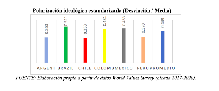 En Chile las posturas del centro ideológico son claramente mayoritarias. Es quizás el país más “centrado” de la subregión. Una medida de polarización social se basa en la dimensión ideológica del autoposicionamiento de los electores, cuando se les pide ubicarse a sí mismos en el continuum izquierda-derecha. El coeficiente de dispersión es un índice de polarización ideológica que relaciona la desviación estándar con la media para cada país. Cuanto más bajo es el número, más centrada estará esa sociedad en la dimensión ideológica izquierda-derecha: